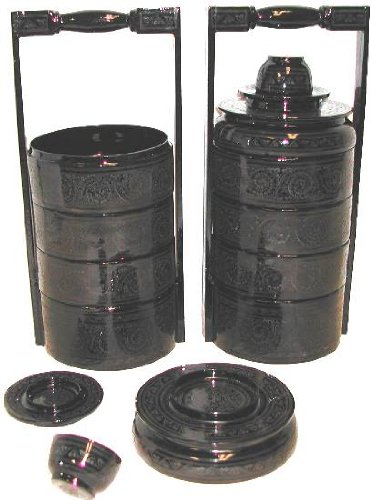 Lacquered Tim Sum Lunch Box, Glossy Black - Pair Shown - Priced Each 14 H